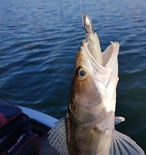 Nous sommes mi janvier, les créneaux météo sont rares, la grisaille et surtout le vent ne nous laissent que de rares moments. Mon fils Quentin et moi profitons d’une journée ensoleillée. Très motivés, nous mettons le bateau à l’eau dans le noir. Nous commençons à naviguer dans l’obscurité et dès le lever du soleil nous faisons nos premiers lancers dans 10 mètres de fond. Nous essayons toujours d’être stratégiques afin de trouver la bonne solution le plus rapidement possible. En coup du matin, il faut balayer un maximum de terrain. Quentin opte donc pour une pêche en linaire, avec un leurre blanc de 4 pouces. Pour ma part, je choisis également de commencer en linéaire avec une lame vibrante métallique.
